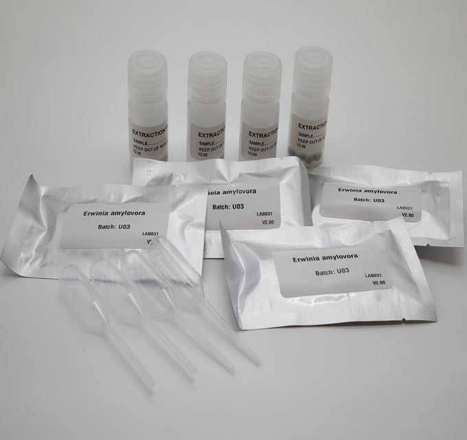 Om bacterievuur vast te stellen in bladeren. Met deze test kan zeer snel bepaald worden of verdacht weefstel (bladeren, steel, stam) aangetast is door bacterievuur. De kit, die wij in ons assortiment hebben opgenomen, bevat vier testen.