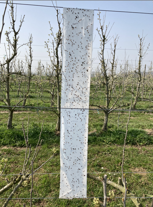 Van 2021 tem 2023 hebben we op 9 appel percelen 10 demo proeven aangelegd door dit dubbelzijdig plaklint op te hangen voordat de zaagwesp begint te vliegen.