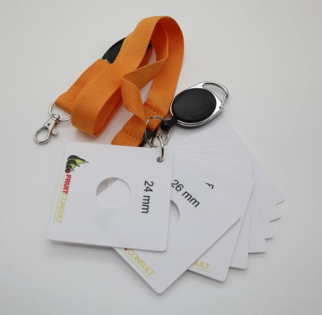 Vruchten met de hand dunnen is niet altijd eenvoudig. Naast het verwijderen van beschadigde vruchten, moeten vaak ook de kleine vruchtjes worden weggenomen. Een ondermaat aangeven is eenvoudig maar praktisch vaak moeilijk uitvoerbaar. Met deze vruchtmaatplaatjes kan wekelijks worden gewisseld van maat.